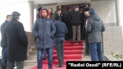 Почти пять десятков сотрудников обменных пунктов собрались 19 декабряперед зданиемНационального банка в Душанбе.