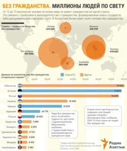 Более семи тысяч человек в Казахстане, согласно данным из открытых источников, не имеют гражданства какой-либо страны. В мире насчитывается от 10 до 15 миллионов лиц без гражданства.